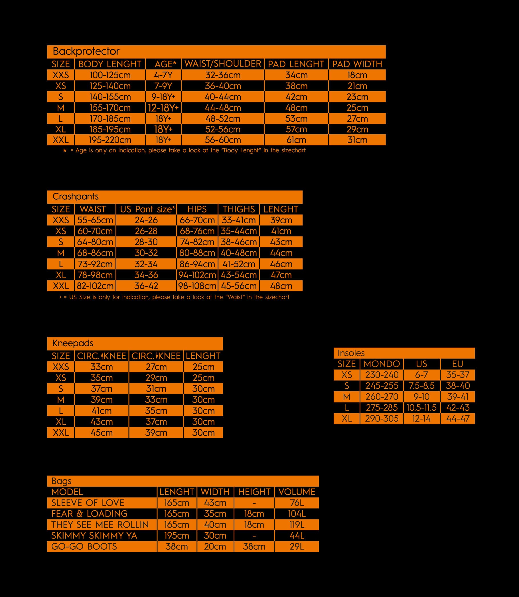 • Size Charts